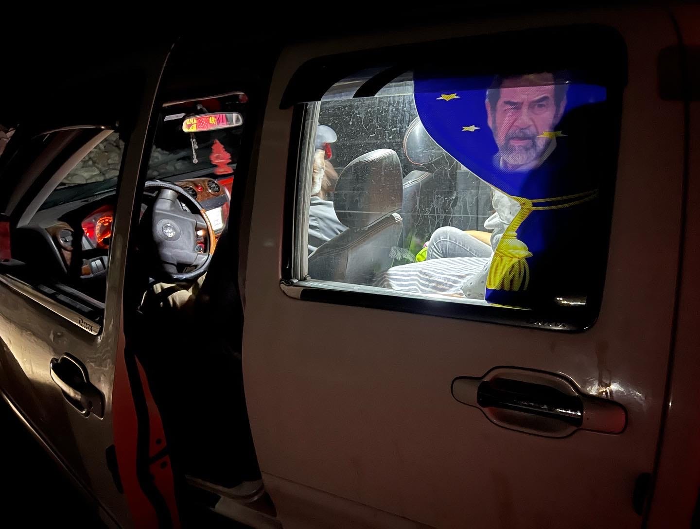 Oh—when Salah's uncle showed up to give us a ride back to the Bedoin camp, Jennifer noticed big photographic decals on the windows of his truck. It was a bit too dark to see them clearly, so Jen asked Abir, "Oh—who's that?"
